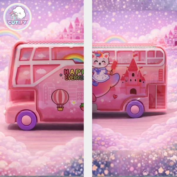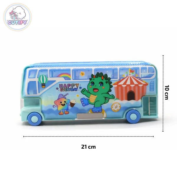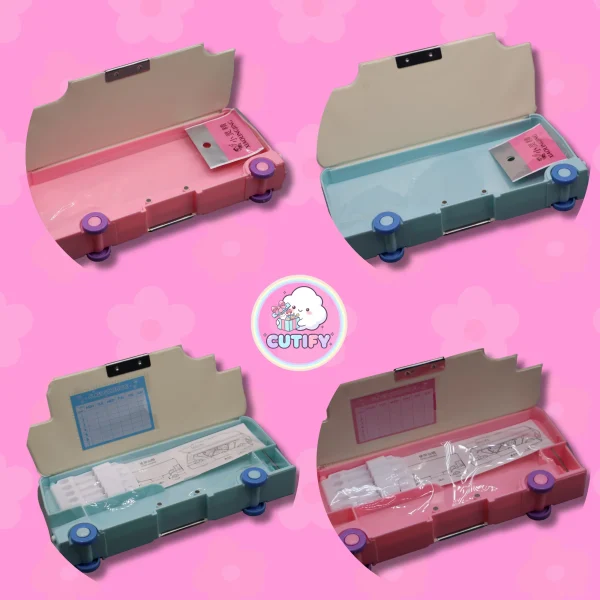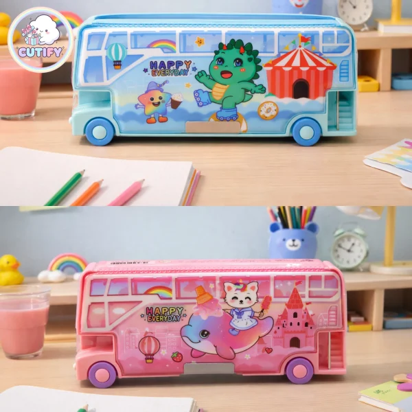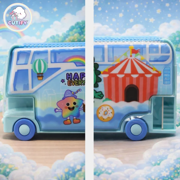 The Bus Geo Box is a fun and practical pencil case designed in the shape of a colorful bus, making it perfect for kids who love playful school accessories. Made from high-quality hard plastic, it offers strong protection for everyday stationery. The front and back covers feature cute cartoon prints, while the decorative wheels enhance the bus-themed design. The box opens with a steel magnetic lid that keeps everything securely closed. Inside, one side includes a white plastic pencil holder organizer with multiple slots to keep pens and pencils neatly arranged, while the other side provides open space for storing additional stationery items. A built-in sharpener attached to the door side adds extra convenience for daily school use.