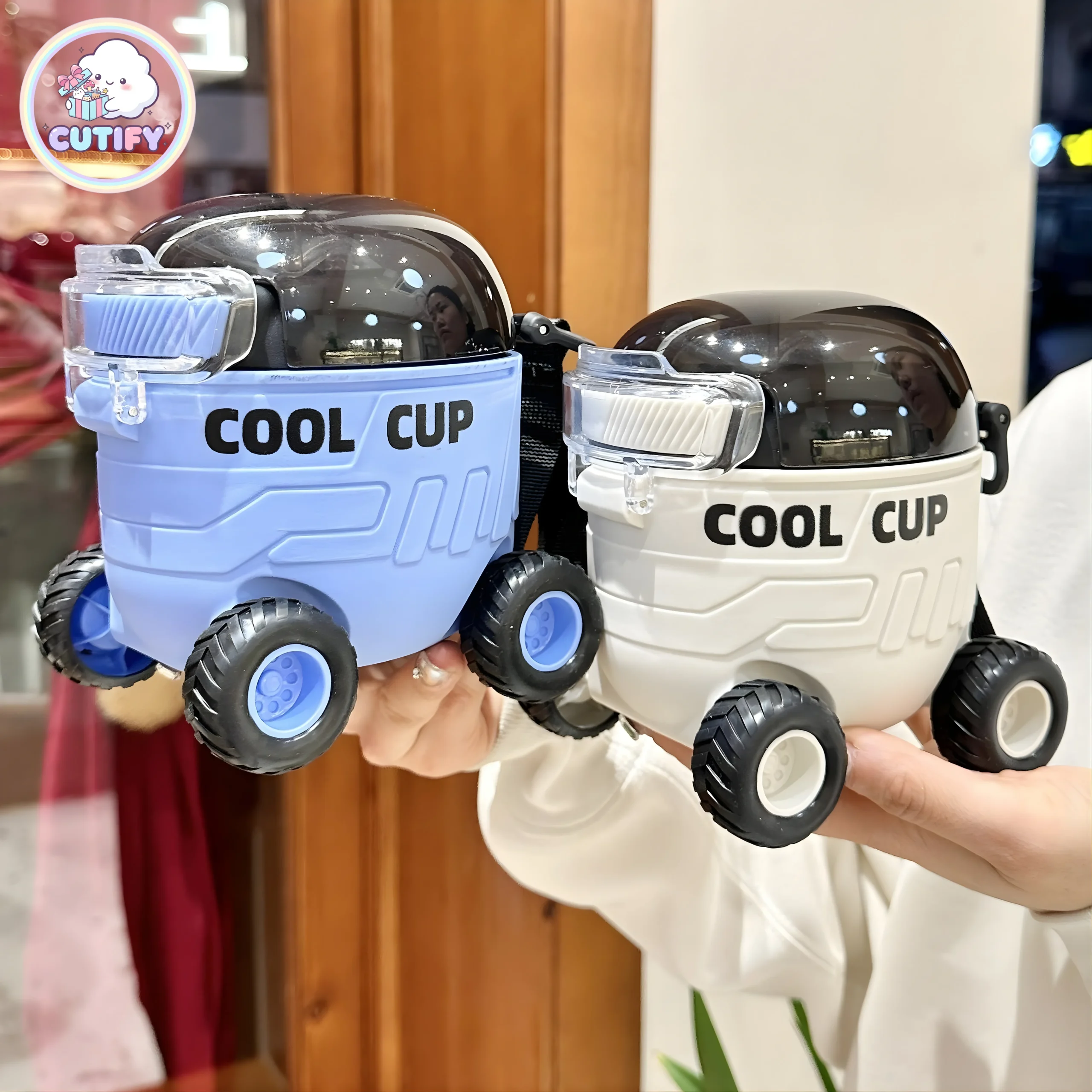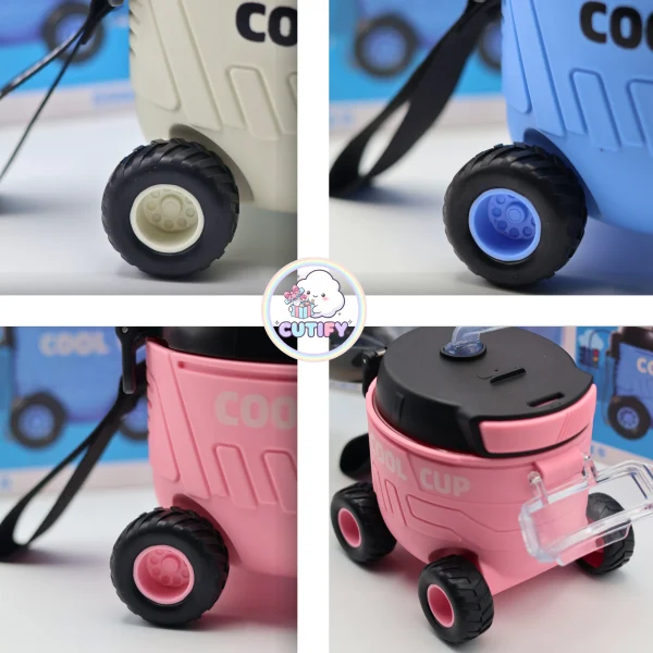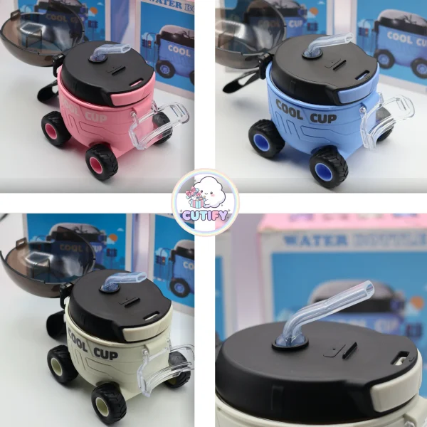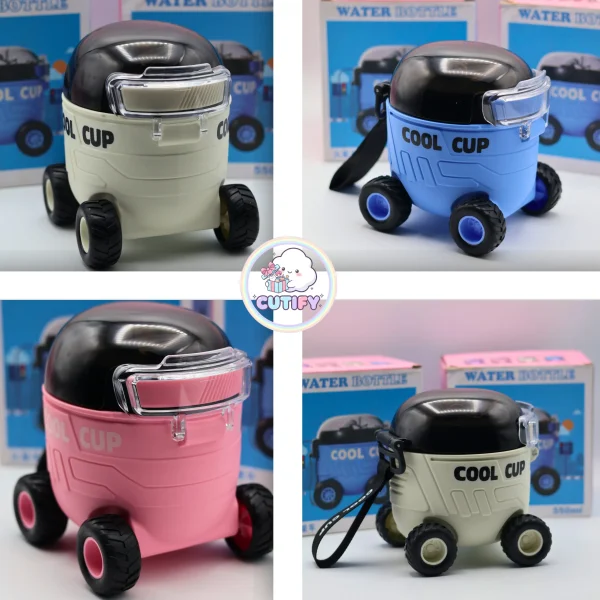 Add fun to everyday hydration with the Car Shaped Water Bottle, designed in a playful mini trolley style with four functional wheels at the base. With a 550ml capacity and compact 12 cm size, it’s easy to carry and perfect for school or outings. The durable plastic body features a bold “COOL CUP” print, while the black dome lid includes a secure snap-lock system to help prevent leaks. A built-in straw makes sipping simple, and the transparent flip cover keeps it clean and hygienic. Complete with an adjustable shoulder strap and available in blue, pink, and off-white, this stylish and stable bottle makes hydration both practical and exciting.