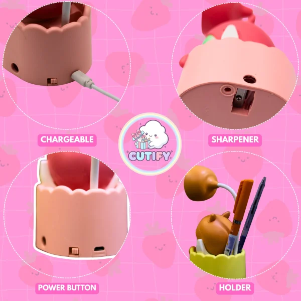 Brighten up your study space with the Cute Animal Shape Chargeable Lamp. Designed as an adorable cartoon cat, this multifunctional desk lamp features soft LED lighting that’s perfect for reading, homework, and night use. It also includes a built-in pen holder to help keep your desk neat and organized. The mood-changing light adds a fun decorative touch, while the 250 mAh rechargeable battery provides 4–5 hours of usage after a full 3–6 hour charge. Compact at 17 cm in height, it fits easily on desks and bedside tables. Available in pink and yellow, this cute and practical lamp comes with a charging cable and packaging box — making it a perfect gift or study companion.