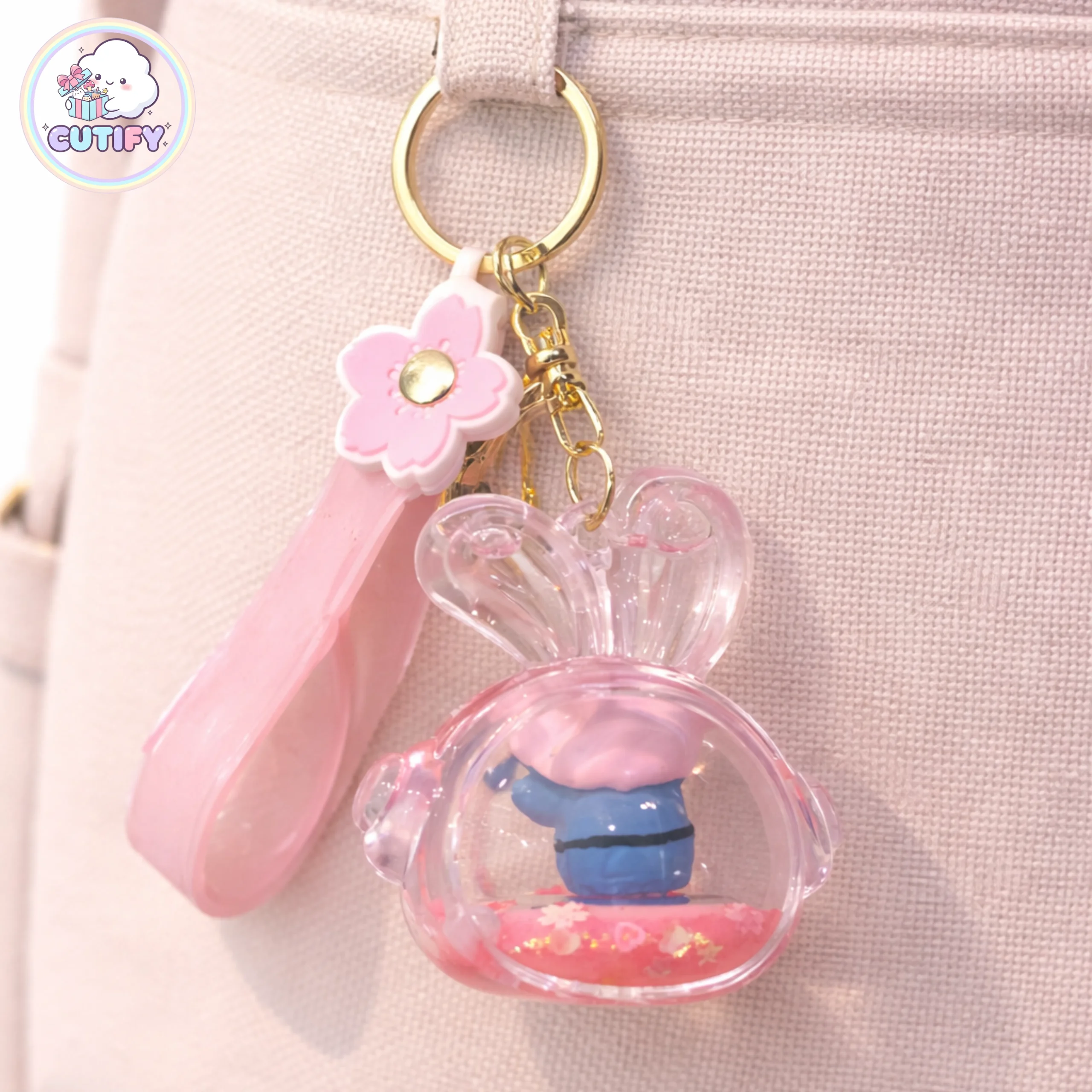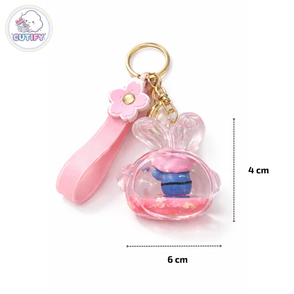 Add a touch of sparkle to your accessories with the Cute Bunny Globe Plastic Keychain. Designed as a transparent bunny-shaped mini globe, it features a tiny character figure inside with floating glitter liquid that creates a charming snow-globe effect when shaken. The compact 4 × 6 cm size makes it lightweight and easy to carry, while the durable plastic body keeps its clear, glossy look. It comes with a soft pink wrist strap decorated with a flower detail and a strong gold-tone metal key ring with a secure clasp for easy attachment to keys or bags. Perfect for everyday use or as a cute gift.