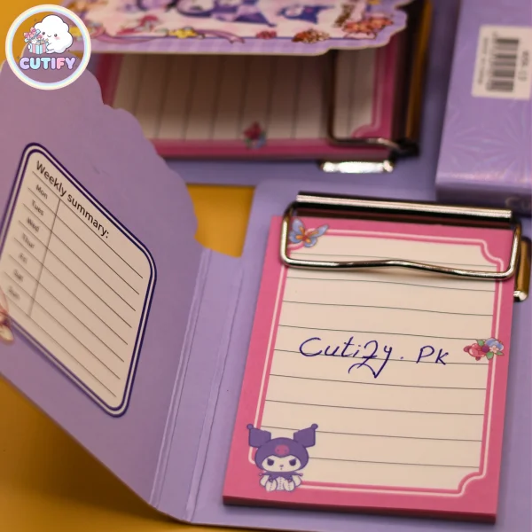 Stay organized in adorable style with the Kuromi Note Pad 2. Designed with a pastel “Cute Pet Garden” theme, this mini note pad features a sturdy hard cover and approximately 25 lined pages for writing daily tasks, reminders, and quick notes. The built-in metal clip securely holds the pages while allowing easy flipping, giving it a practical clipboard-style design. Inside, a printed weekly summary section helps you plan and organize efficiently. Measuring 8 cm × 11 cm, it’s compact and lightweight—perfect for carrying in handbags, backpacks, or keeping on your desk for everyday use.
